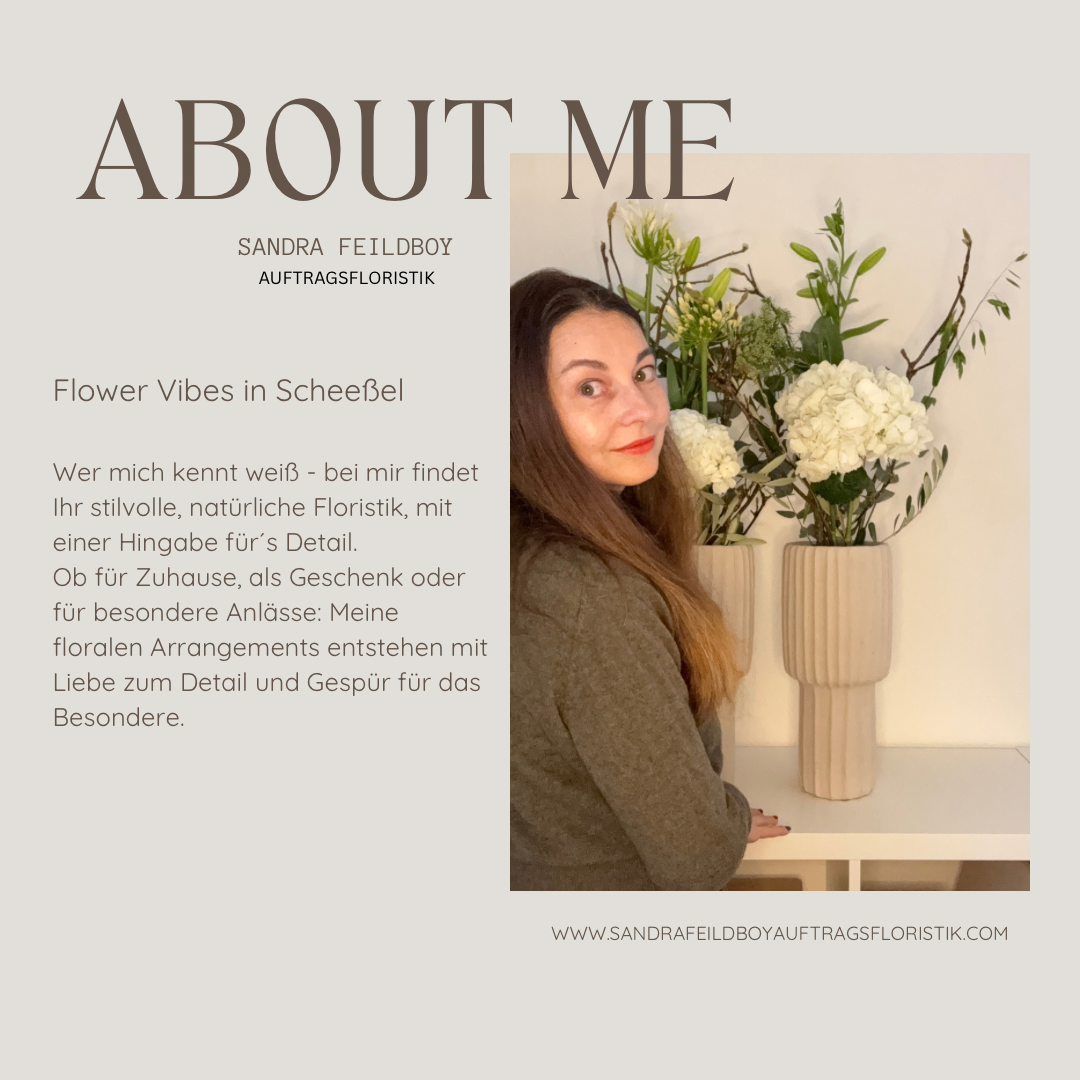 Nach vielen Anfragen und vielen Gesprächen mit mir selbst, habe ich meinen Weg als Auftragsfloristin eingeschlagen. Es ist die Verwirklichung einer Idee, die mir ermöglicht, meine Kreativität und die Leidenschaft für meinen Beruf zu leben und euch mit individueller floraler Handwerkskunst zu begeistern.